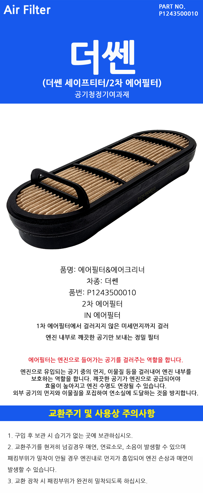 > 대우트럭 더쎈 에어필터 세이프티 2차 엔진 에어필터 에어크리너 에어클리너 1243500010