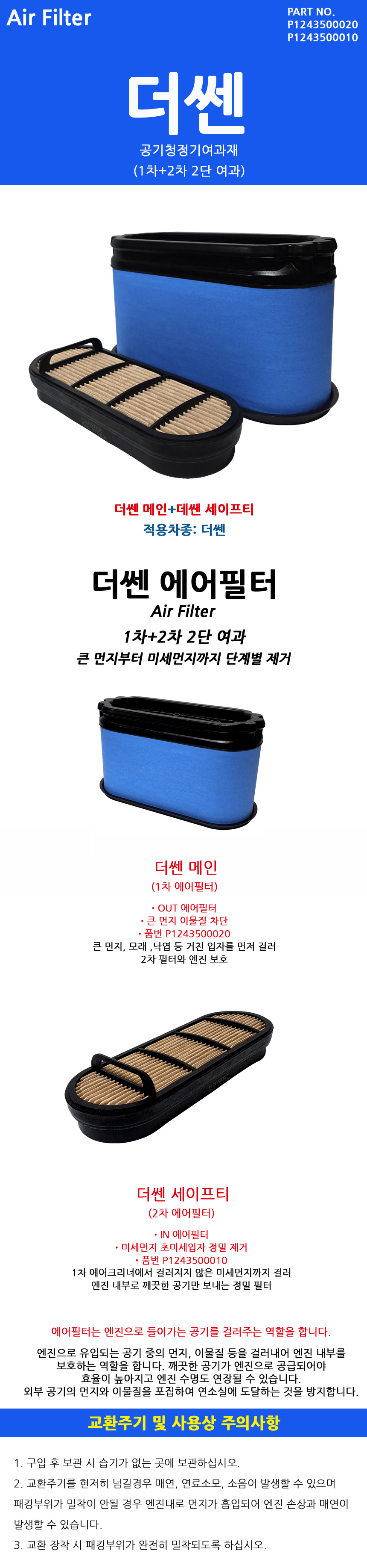 > 대우트럭 더쎈 엔진 에어필터 에어크리너 에어클리너 더쎈메인 더쎈세이프티 1차 2차 IN OUT 1243500020 1243500010 세트
