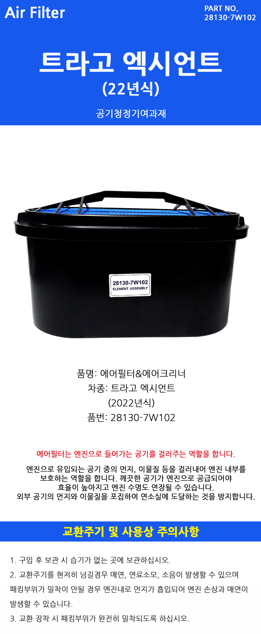 현대트럭 뉴 엑시언트 트라고 엑시언트 신형 엔진 에어필터 에어크리너 에어클리너 차량용 공기청정기여과재 28130-7W102 2022년식